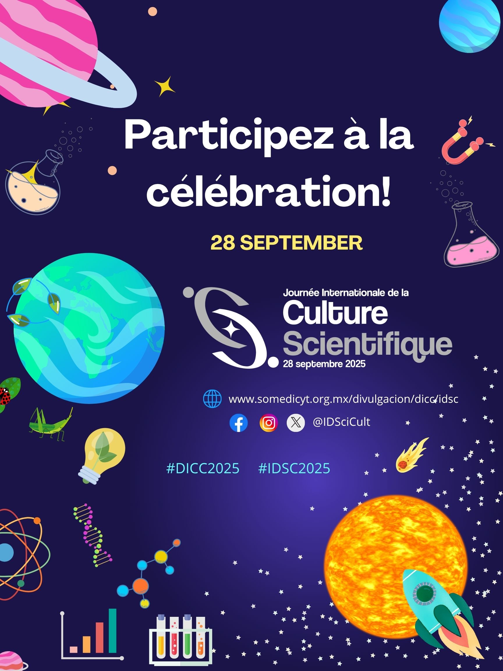 Publicar ese video en la página web, Facebook, Instagram o canales de YouTube personales, entre la noche del viernes 27 de septiembre y la mañana del sábado 28, acompañando el video de los hashtags #DíaCulturaCientífica, #ScienceCulturaDay, #DICC2025 o #IDSC2025, además de etiquetar los perfiles oficiales: