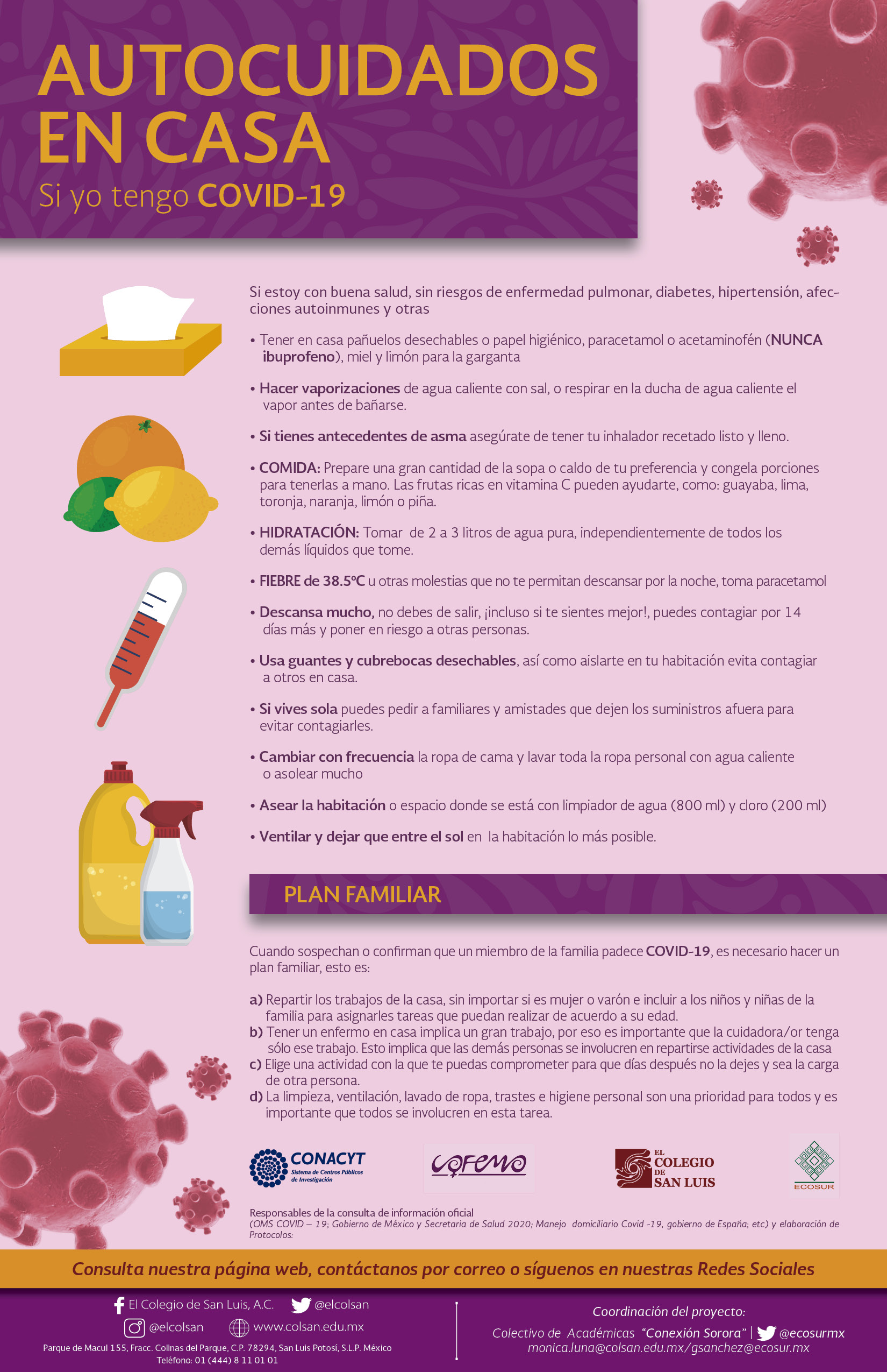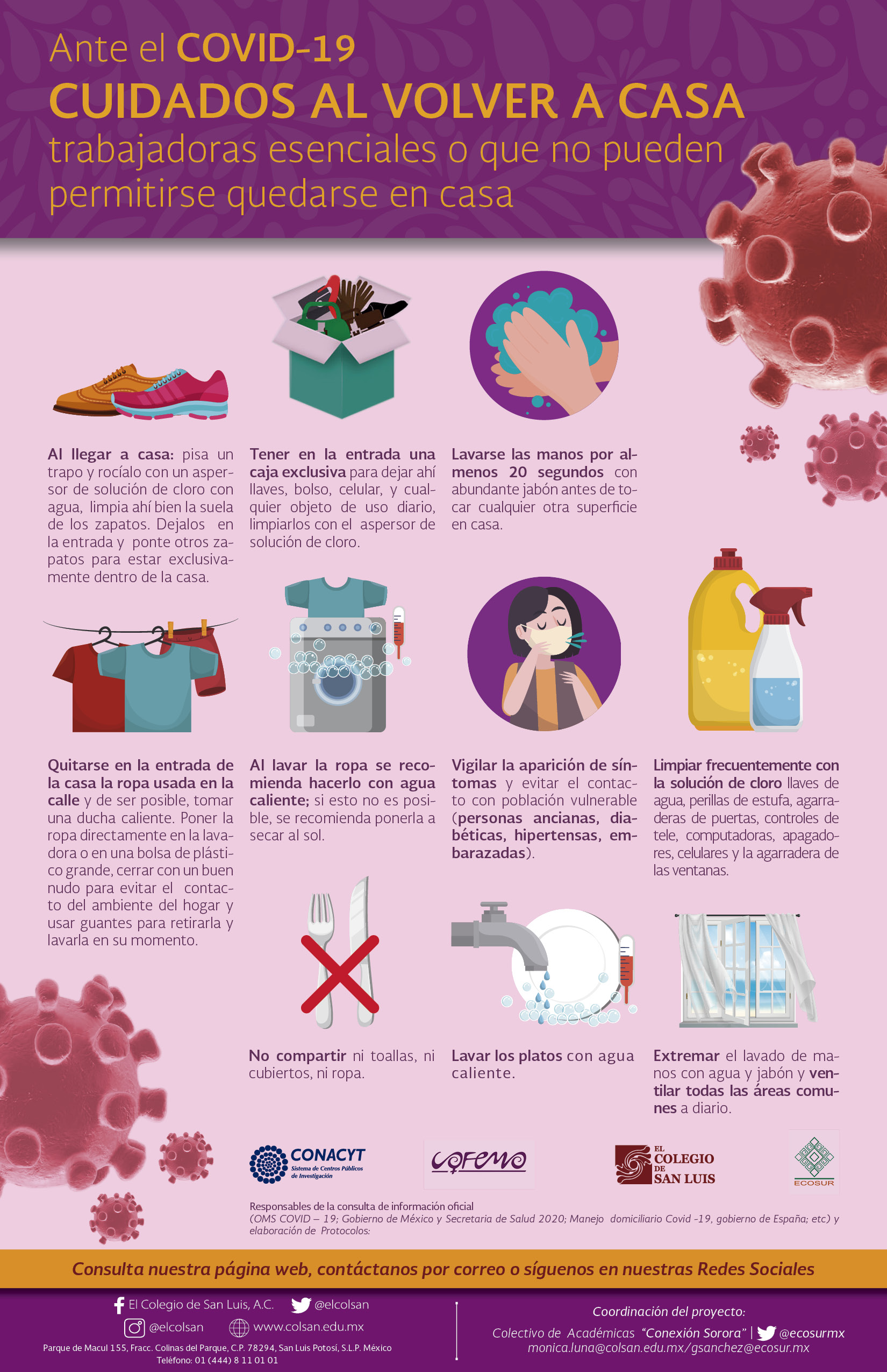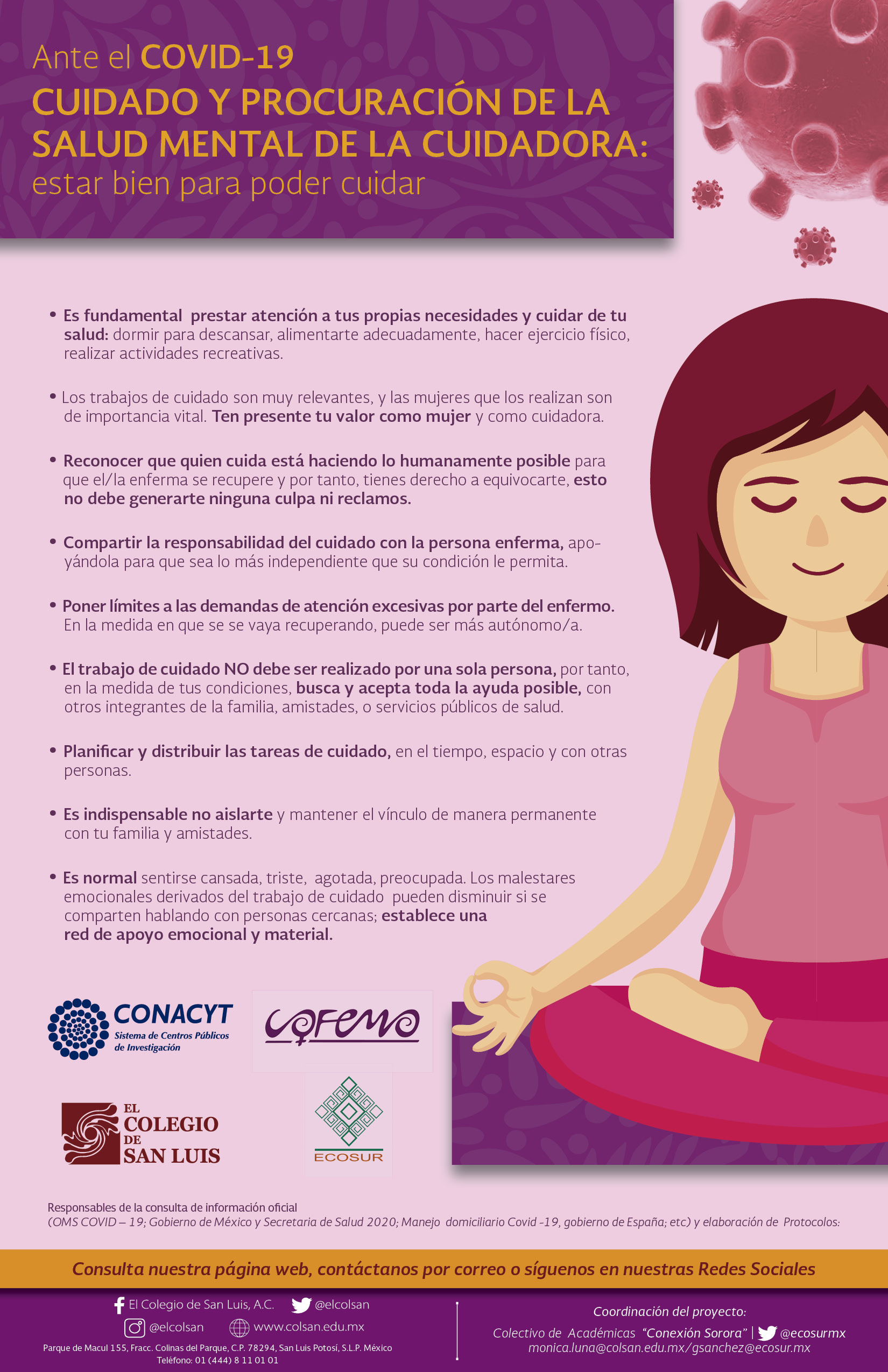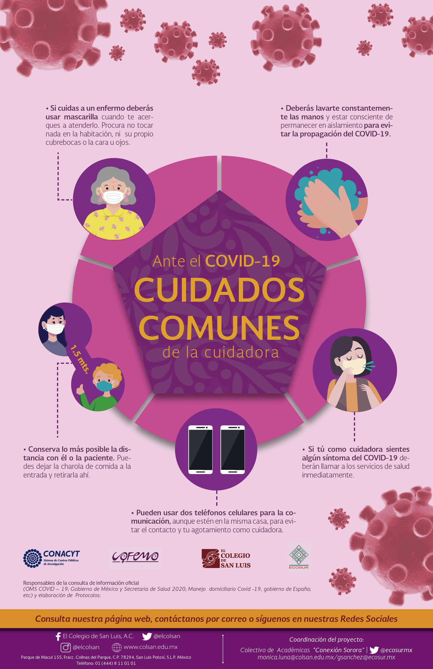 Información preventiva sobre COVID-19 con un enfoque de género y salud para mujeres que desarrolló el Colegio de San Luis (México), el Colectivo Feminista Mercedes Olivera y el Psychiatrische Institutsambulanz Winsen (Alemania). Los contenidos y el diseño son originales de la colectiva Conexión Sororal.