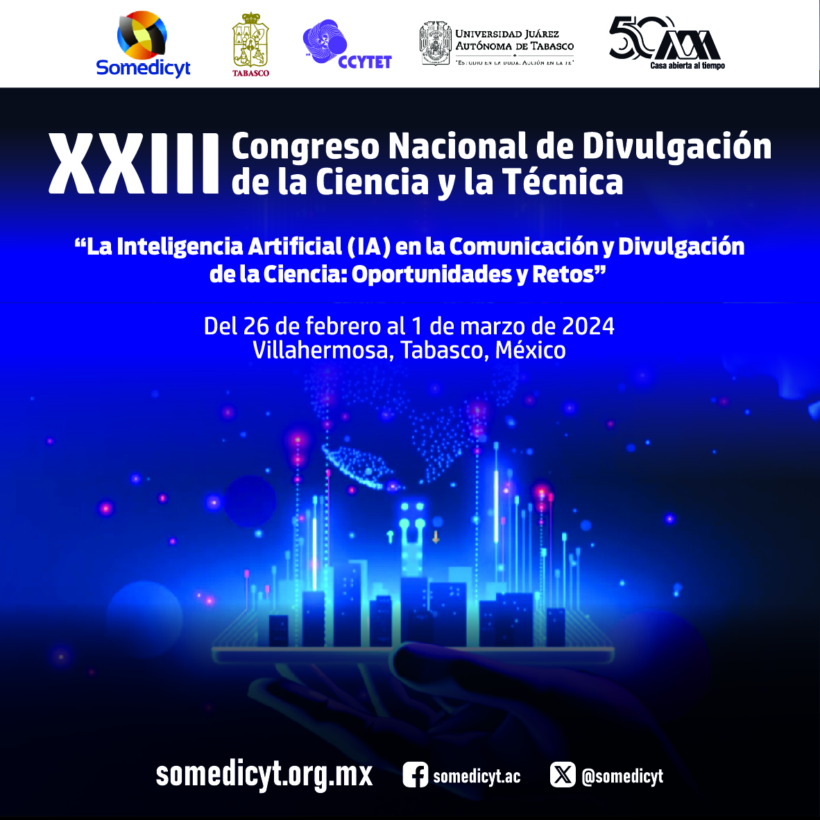 La Sociedad Mexicana para la Divulgación de la Ciencia y la Técnica, A.C. (Somedicyt) y el Consejo de Ciencia y Tecnología del Estado de Tabasco (CCYTET), con el apoyo de la Universidad Juárez Autónoma de Tabasco (UJAT) y la Universidad Autónoma Metropolitana (UAM)